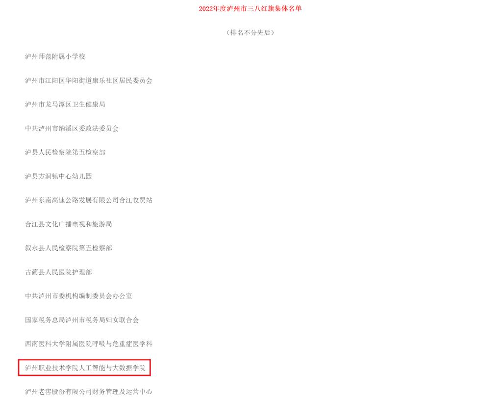 近日,泸州市妇女联合会公布2022年度泸州市“三八”红旗手、泸州市“三八”红旗集体名单,人工智能与大数据学院荣获2022年度泸州市“三八”红旗集体称号。
